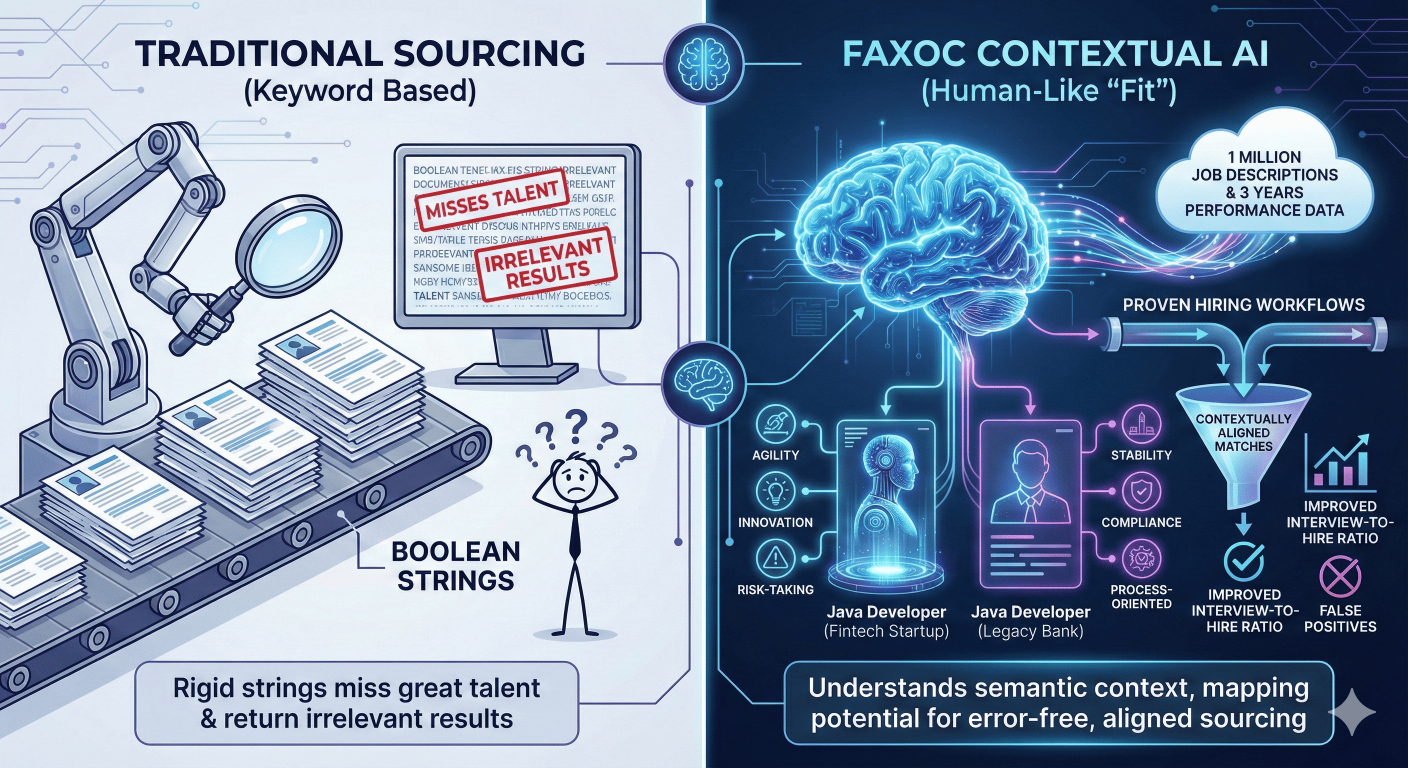Most sourcing tools rely on rigid Boolean strings that miss great talent or return irrelevant results. Faxoc’s automated sourcing engine is different. Trained on 1 million job descriptions and three years of performance data, our AI understands the semantic context of a role. It recognizes that a "Java Developer" in a fintech startup requires different soft skills than one in a legacy bank. We map candidate potential against thousands of proven hiring workflows to deliver matches that aren't just technically qualified, but contextually aligned. This ensures error-free sourcing that drastically improves your interview-to-hire ratio and eliminates false positives.