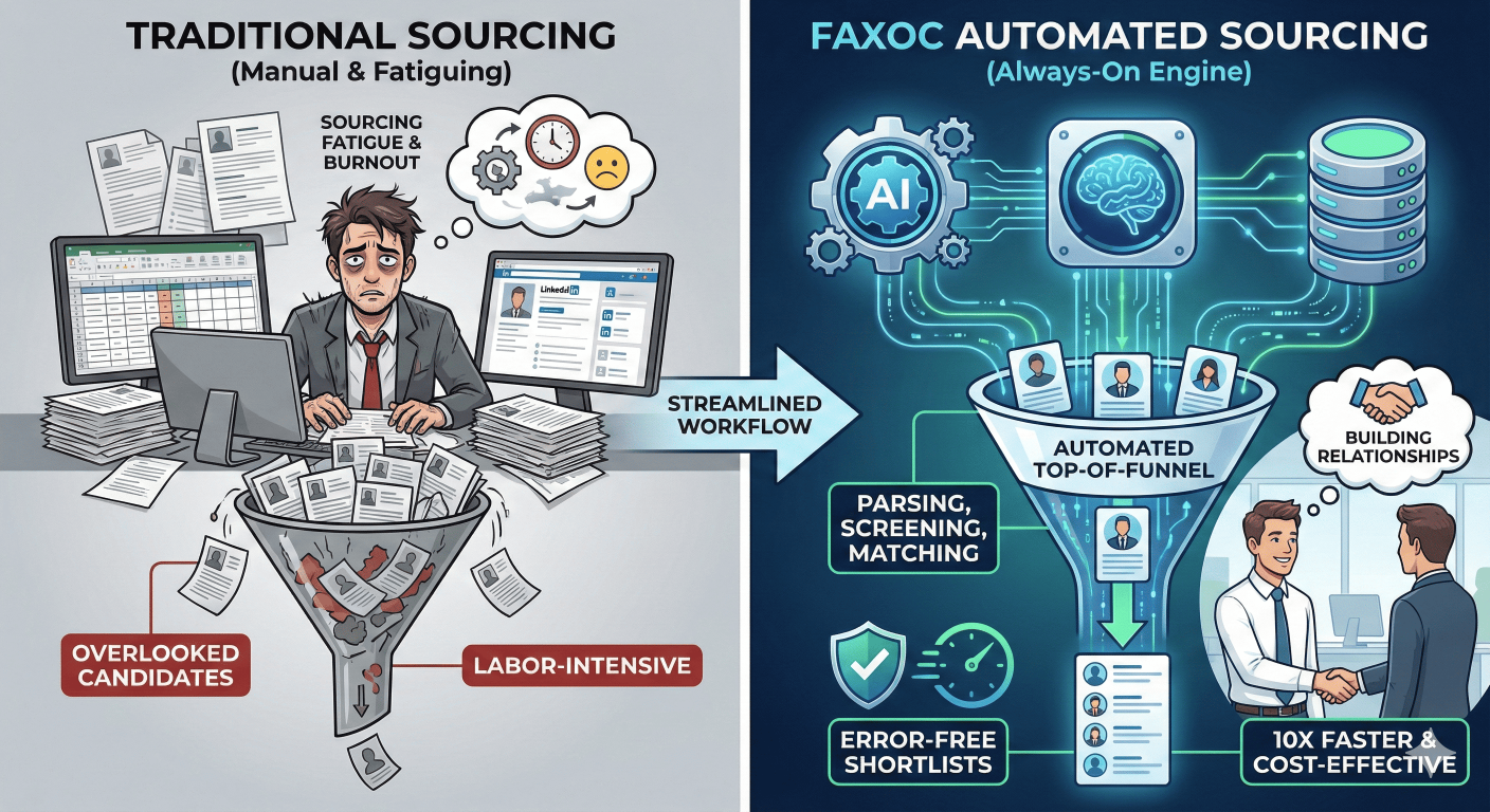 Traditional sourcing is the biggest bottleneck in recruitment. Recruiters spend countless hours manually sifting through portals and LinkedIn, often missing hidden gems. Faxoc changes the game by deploying a proprietary AI infr Read More