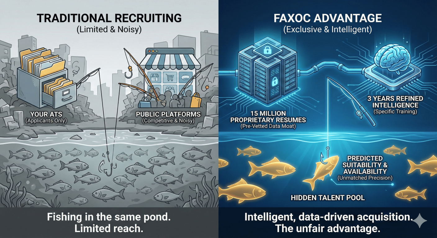 Your ATS is limited to who applied, and public platforms are noisy and competitive. Faxoc gives you an unfair advantage with an exclusive, pre-vetted infrastructure layer built on 15 million proprietary resumes. This isn't just raw data; it is intelligence refined over three years of specific training. By plugging into Faxoc, enterprises gain immediate access to a hidden talent pool that standard tools cannot reach. Our automated sourcing leverages this data moat to predict availability and suitability with unmatched precision. Stop fishing in the same pond as your competitors and start leveraging an infrastructure built for intelligent, data-driven acquisition.