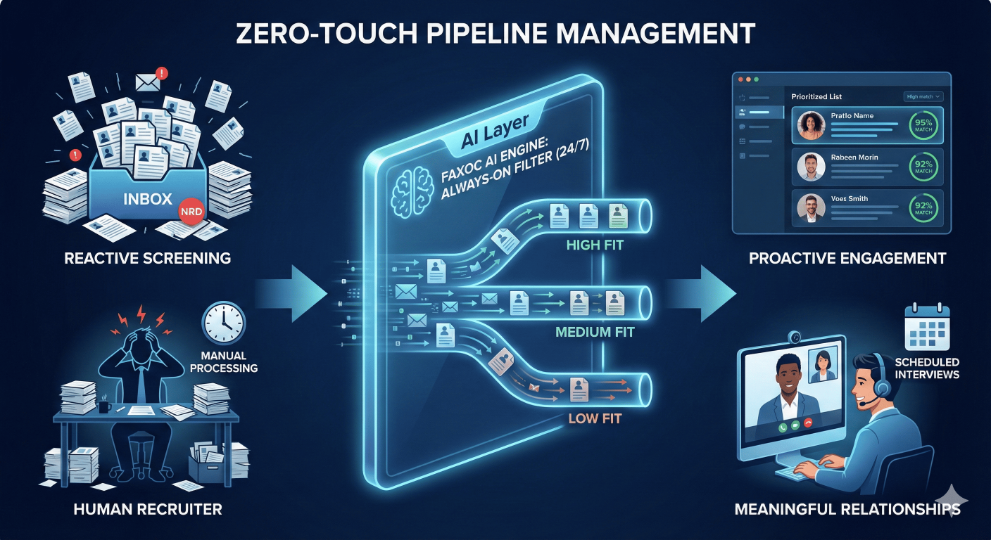 Faxoc transforms your recruitment operations by moving from reactive screening to proactive engagement. Our automated scoring engine serves as an always-on filter, processing applications 24/7 without human intervention. As candidates apply, they are instantly graded, sorted, and prioritized based on a deep analysis of their fit. This means your recruiters start every day with a clean, prioritized list of high-potential interviews rather than a cluttered inbox of unread resumes. By automating the top-of-funnel logic, we empower your HR team to stop administrative processing and start building meaningful relationships with the candidates who actually matter.