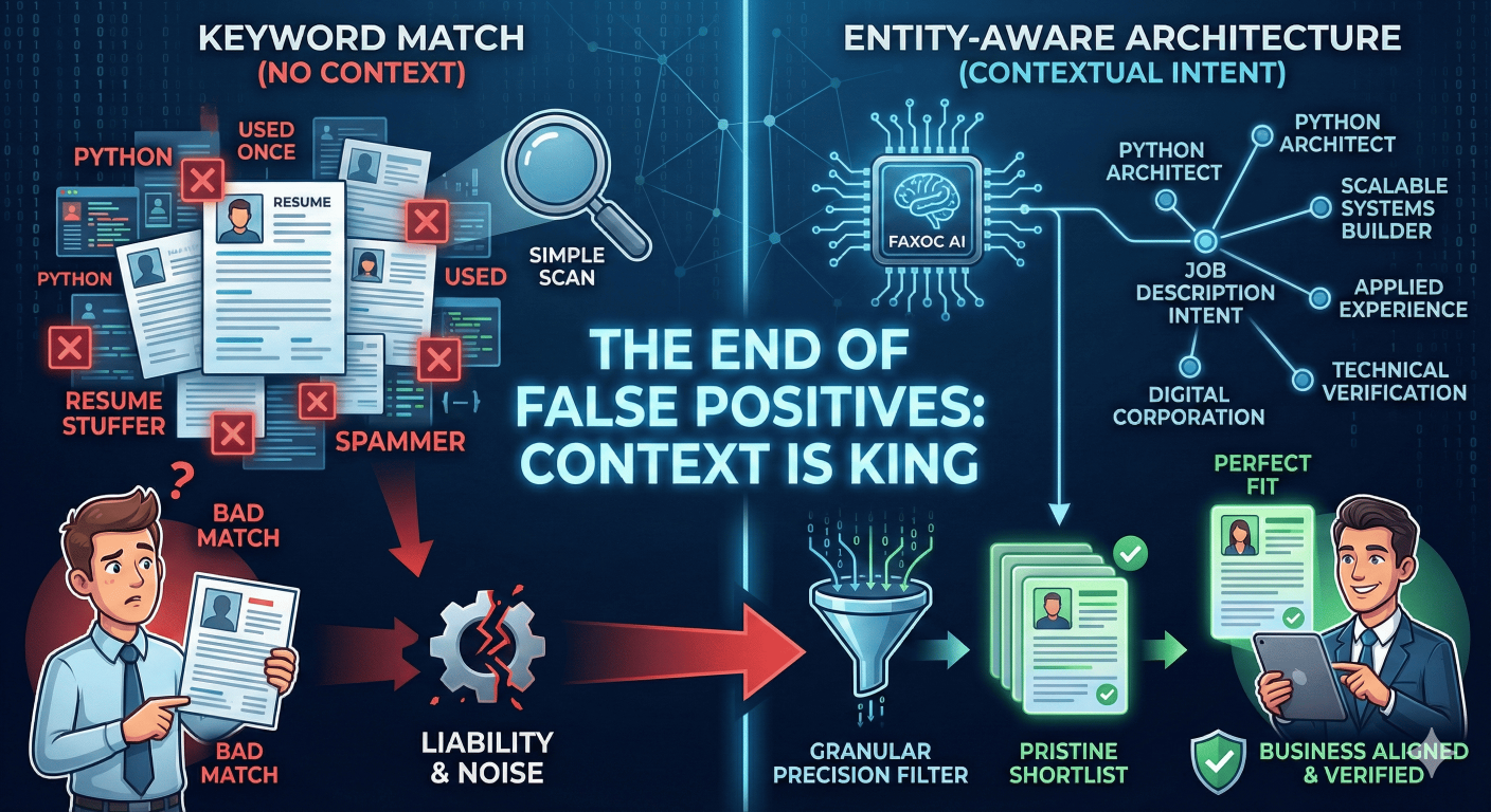 In enterprise recruitment, context is everything. A keyword match without context is a liability. Faxoc's Entity-Aware architecture solves this by mapping the precise intent behind every job description. We don't just scan for skills; we analyze how they are applied. Our system differentiates between a candidate who simply "used" Python once and an "Architect" who builds scalable systems with it. This granular precision filters out the noise of resume stuffers and keyword spammers, delivering a pristine shortlist where every candidate is technically verified and contextually aligned with your business needs.