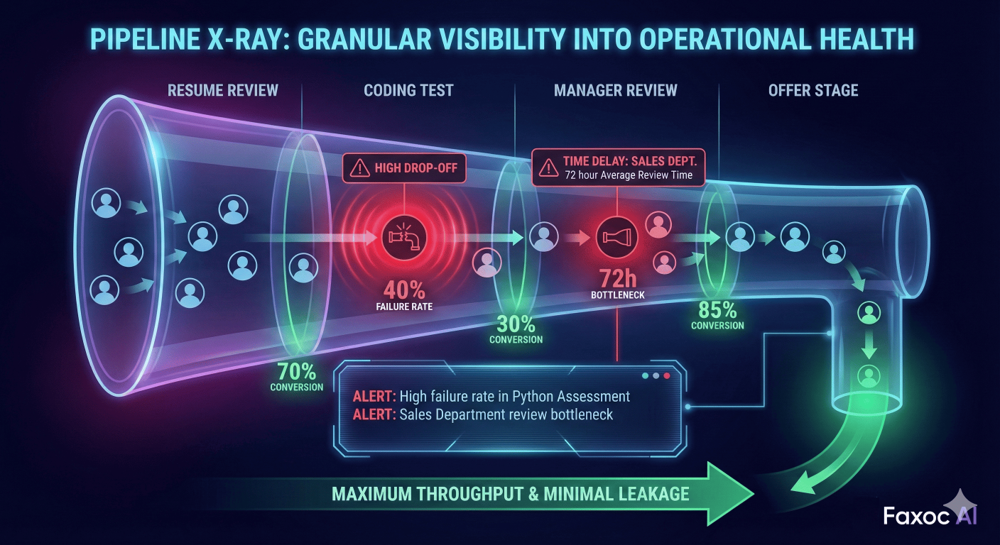 Where are you losing your best candidates? Is it the coding test, the hiring manager review, or the offer stage? Faxoc provides an X-Ray view of your entire recruitment funnel. We track conversion rates at every granular stage, instantly highlighting bottlenecks and drop-off points. If a specific department is taking too long to review resumes, or if a specific assessment has an abnormally high failure rate, our dashboard flags it immediately. We give you the operational intelligence to diagnose friction points and optimize your process in real-time, ensuring maximum throughput and minimal candidate leakage.